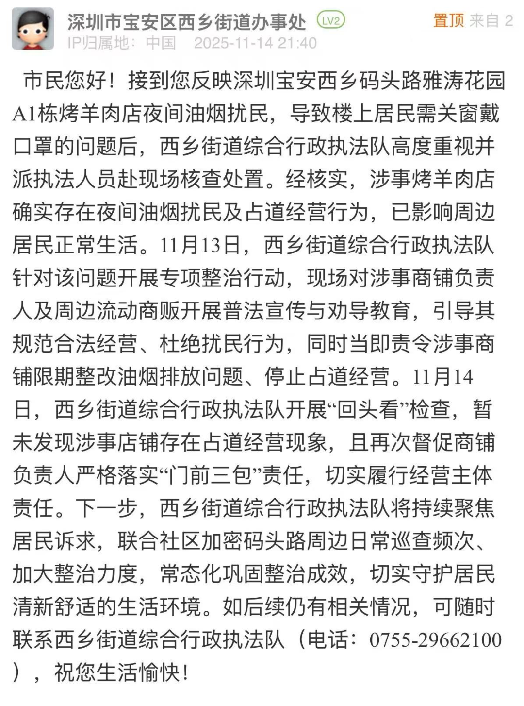 案例點(diǎn)評(píng):接到市民反映后,街道迅速響應(yīng),當(dāng)日開展核查,次日回應(yīng)進(jìn)展,處置高效。針對(duì)涉事店鋪油煙問題,執(zhí)法隊(duì)不僅現(xiàn)場(chǎng)開展普法勸導(dǎo),責(zé)令商鋪限期整改,更在次日開展“回頭看”檢查,及時(shí)跟進(jìn)整改進(jìn)度、壓實(shí)經(jīng)營主體責(zé)任?;貞?yīng)中,街道明確下一步將聯(lián)合社區(qū)加密日常巡查、加大整治力度,常態(tài)化鞏固整治成效,體現(xiàn)出緊盯民生痛點(diǎn)、深耕基層精細(xì)化治理、全力守護(hù)居民舒適生活環(huán)境的決心。