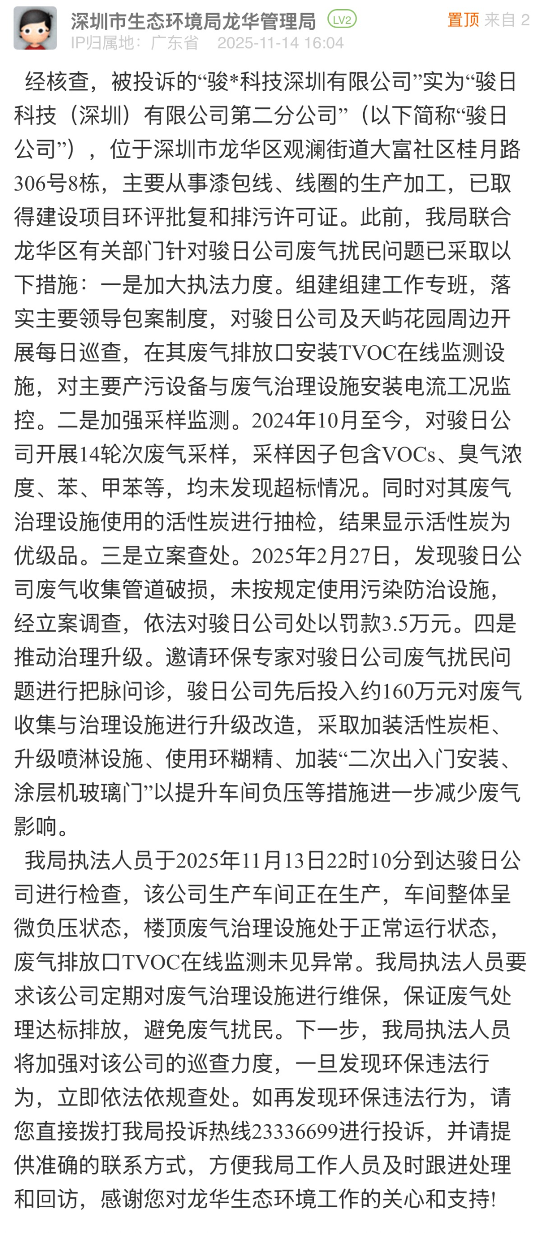 優(yōu)化建議:針對(duì)市民反映的工業(yè)廢氣擾民問題,相關(guān)部門雖采取巡查監(jiān)測(cè)、立案查處、推動(dòng)設(shè)備升級(jí)等舉措,但未能實(shí)質(zhì)性化解居民困擾。在該問政網(wǎng)帖的評(píng)論區(qū),有多位業(yè)主留言反映,近一年來“天天聞到臭氣”,并對(duì)“采樣均未發(fā)現(xiàn)超標(biāo)情況”的回復(fù)表示質(zhì)疑。建議相關(guān)部門在依托專業(yè)設(shè)備檢測(cè)的同時(shí),結(jié)合居民“嗅辨”反饋開展精準(zhǔn)溯源,切實(shí)回應(yīng)群眾對(duì)清新環(huán)境的基本訴求,推動(dòng)治理從“數(shù)據(jù)達(dá)標(biāo)”轉(zhuǎn)向“群眾滿意”。