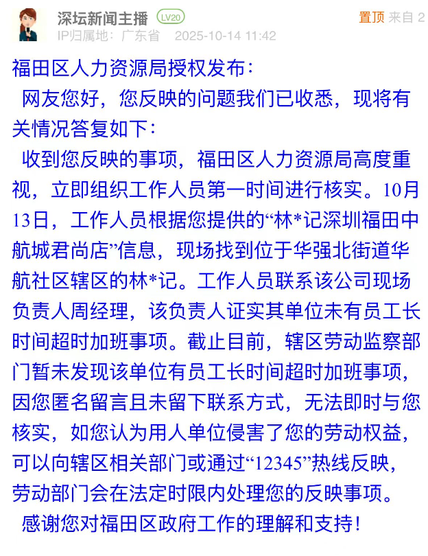 優(yōu)化建議:網(wǎng)民投訴的核心有兩點(diǎn),一是外包公司無勞務(wù)派遣資質(zhì)卻代繳社保、發(fā)放工資,二是工作時(shí)間過長(zhǎng)。福田區(qū)人力資源局雖回應(yīng)已核實(shí)涉事餐飲單位“無長(zhǎng)時(shí)間超時(shí)加班”,但對(duì)網(wǎng)民反映的外包公司無資質(zhì)這一關(guān)鍵問題未作回應(yīng)。此情況反映出,資質(zhì)核查工作亟需加強(qiáng),如對(duì)相關(guān)餐飲單位開展用工合規(guī)專項(xiàng)檢查,以精準(zhǔn)舉措解決無資質(zhì)外包這一核心痛點(diǎn),提升市民對(duì)勞動(dòng)者權(quán)益保障工作的認(rèn)可度。