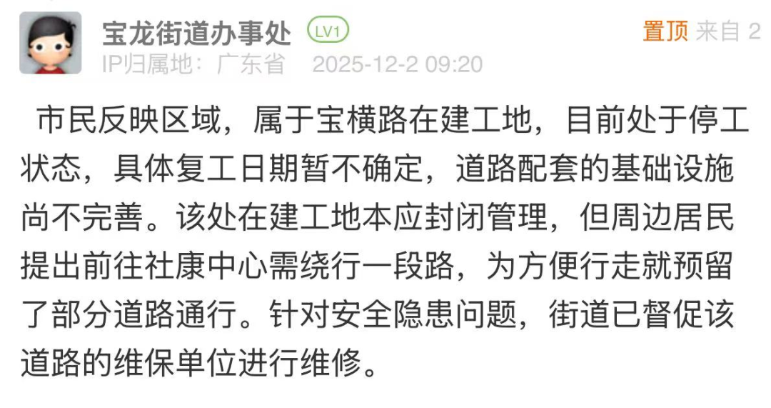 優(yōu)化建議:針對市民反映的道路在建工地預留道路路燈暗淡、路磚碎裂等問題,帖文回應存在“解釋多、舉措少”的短板,未能化解群眾多次投訴無果的不滿。同時,“復工日期暫不確定”的表述易引發(fā)市民的疑惑與不滿,后續(xù)有市民在評論區(qū)反饋該道路仍未啟動維修工作,建議責任單位主動協(xié)同項目建設(shè)、施工等責任主體,明確給出復工的預估時間或階段性處置方案及臨時性保障措施,推動問題解決。