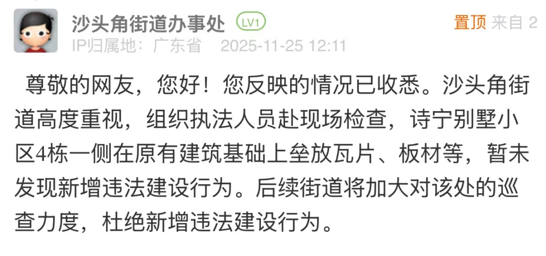 針對網(wǎng)民投訴的小區(qū)違建問題,街道回應僅以“未發(fā)現(xiàn)新增違法建設(shè)行為”簡單回復,尚有完善空間。若該點位存在建設(shè)年代久遠、權(quán)屬界定模糊、涉及多主體協(xié)調(diào)等客觀難點,可適度說明,并在回應中補充核查細節(jié),說明后續(xù)處置方向與階段計劃,讓回應更具可信度和實操性,回應市民對“依法履職”的期待。