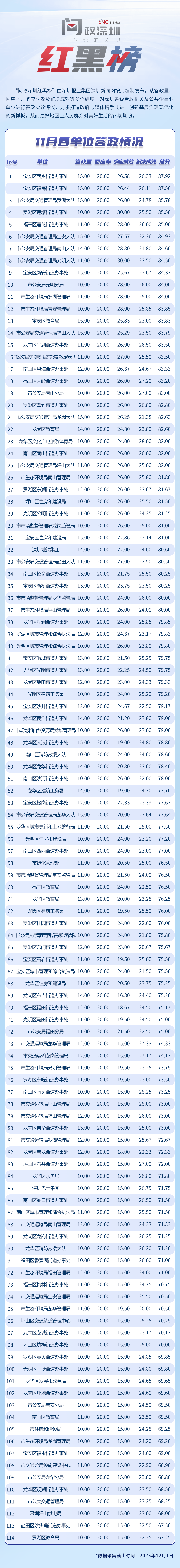 為探尋媒體如何精準賦能基層治理現(xiàn)代化的“深圳路徑”,深圳報業(yè)集團正式掛牌成立“問政深圳”工作室,旨在進一步推動網(wǎng)絡(luò)問政工作的高效開展。為確保相關(guān)工作更加契合實際需求,深圳報業(yè)集團深圳新聞網(wǎng)按照“最快速度辦結(jié)”的總體要求,將原有月度榜單創(chuàng)新升級為“問政深圳紅黑榜”,并對評分體系進行了細致優(yōu)化。該榜單從答政量、回應率、響應時效及解決成效等多個維度,對深圳各級黨政機關(guān)及公共企事業(yè)單位進行答政實效評議,力求打造政府與媒體攜手共進、創(chuàng)新基層治理現(xiàn)代化的新樣板,從而更好地回應人民群眾對美好生活的熱切期盼。