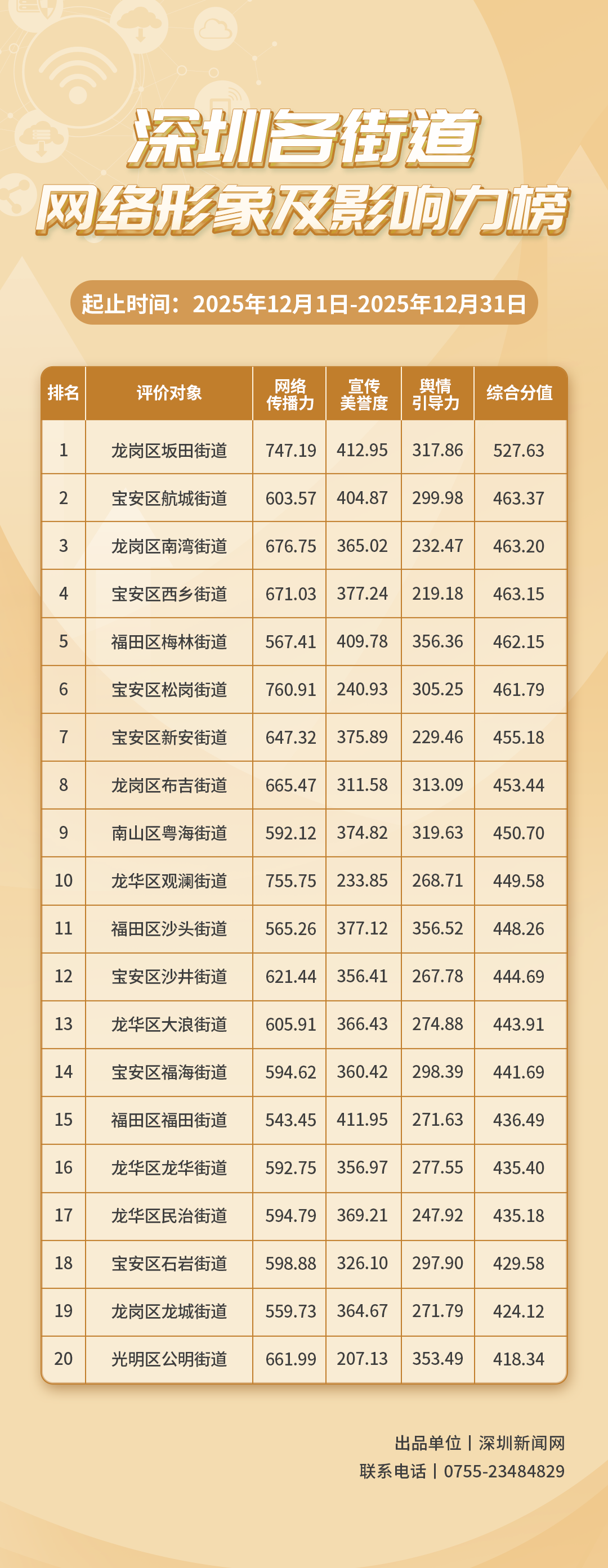 2025年12月,共有20個(gè)街道登上《深圳各街道網(wǎng)絡(luò)形象及影響力榜》,分別是:龍崗區(qū)坂田街道、寶安區(qū)航城街道、龍崗區(qū)南灣街道、寶安區(qū)西鄉(xiāng)街道、福田區(qū)梅林街道、寶安區(qū)松崗街道、寶安區(qū)新安街道、龍崗區(qū)布吉街道、南山區(qū)粵海街道、龍華區(qū)觀瀾街道、福田區(qū)沙頭街道、寶安區(qū)沙井街道、龍華區(qū)大浪街道、寶安區(qū)福海街道、福田區(qū)福田街道、龍華區(qū)龍華街道、龍華區(qū)民治街道、寶安區(qū)石巖街道、龍崗區(qū)龍城街道、光明區(qū)公明街道。