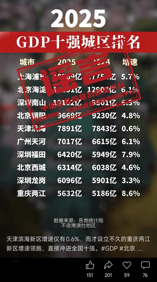 辟 謠 網(wǎng)傳“濱海新區(qū)2025年GDP增速0.6%”系虛假信息
