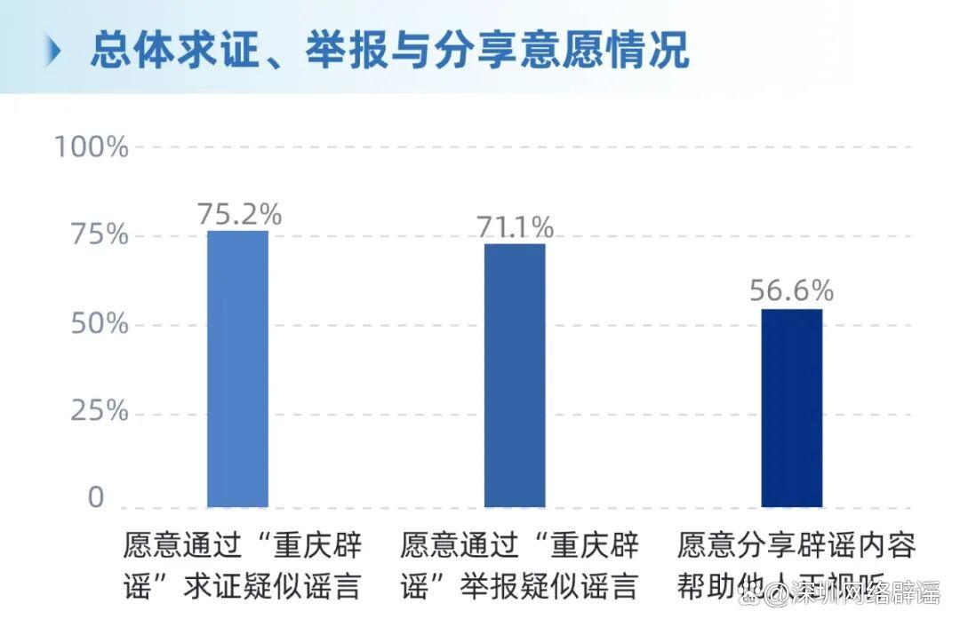 ·愿意通過“重慶辟謠”求證疑似謠言的占75.2%,愿意通過“重慶辟謠”舉報(bào)疑似謠言的占71.1%,愿意分享辟謠內(nèi)容幫助他人正視聽的占56.6%。