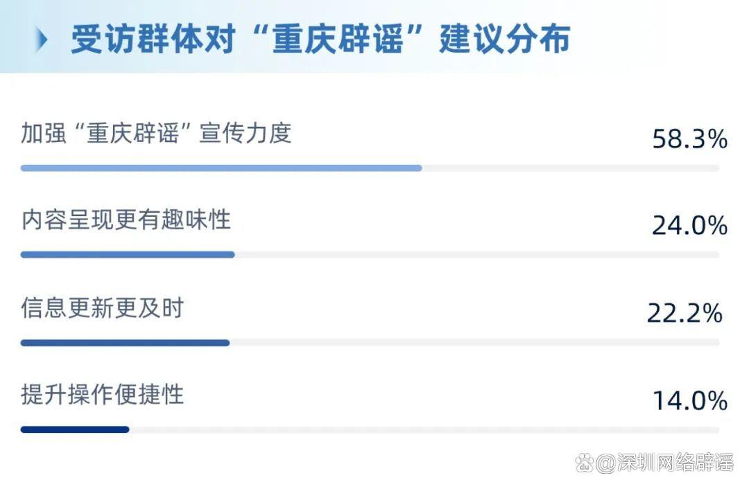 ·公眾對(duì)“重慶辟謠”的改進(jìn)訴求鮮明,加強(qiáng)宣傳力度占比58.3%,與8.4%的知曉率形成直接呼應(yīng)。