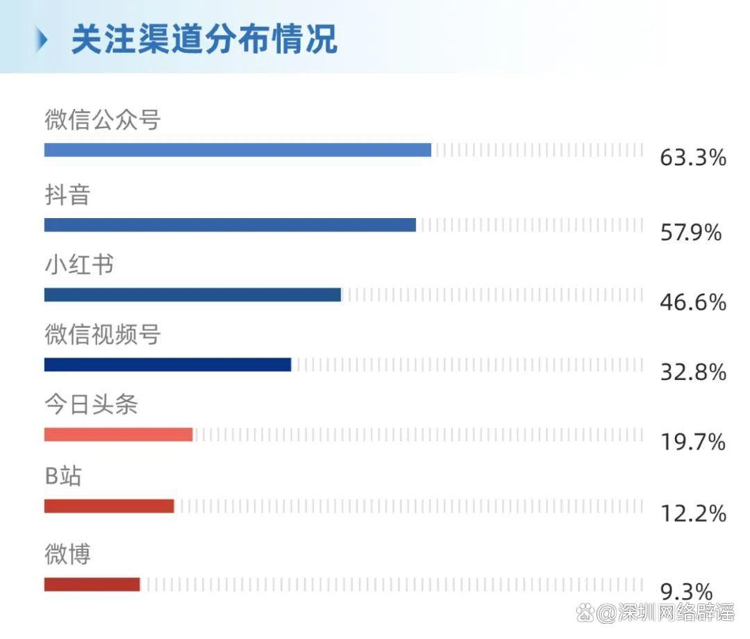 ·整體占比:微信公眾號(hào)(63.3%)、抖音(57.9%)占據(jù)主導(dǎo),小紅書、微信視頻號(hào)、今日頭條次之,B站(12.2%)、微博(9.3%)占比較低。