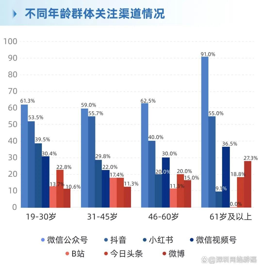 61歲及以上:微信公眾號(hào)占比91.0%,對(duì)抖音(55.0%)、微信視頻號(hào)(36.5%)依賴度也較高。