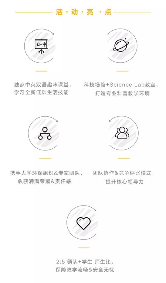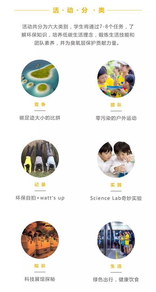 1.在一天時(shí)間內(nèi)挑戰(zhàn)“臭氧英雄·低碳足跡”國(guó)際主題活動(dòng),學(xué)習(xí)低碳生活技能,感受中英雙語(yǔ)課堂;