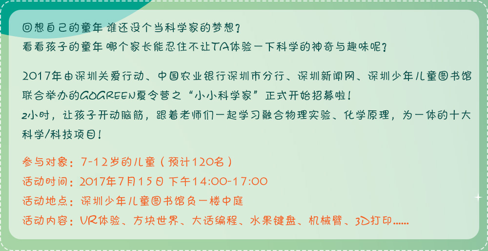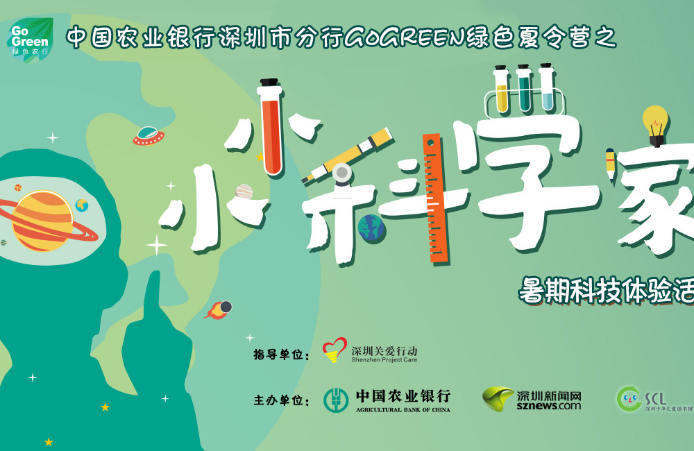 GO GREEN綠色夏令營之“小小科學(xué)家”活動由深圳市關(guān)愛辦、中國農(nóng)業(yè)銀行深圳市分行、深圳新聞網(wǎng)、深圳市少年兒童圖書館聯(lián)合舉辦。2個小時的活動,讓孩子開動腦筋,跟著老師學(xué)習(xí)融合物理實驗、化學(xué)原理,為一體的十大科學(xué)/科技項目。[詳細(xì)]