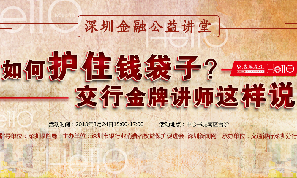 3月24日,深圳新聞網(wǎng)攜手深圳市銀行業(yè)消費(fèi)者權(quán)益保護(hù)促進(jìn)會(huì)舉辦的《深圳金融公益講堂》,將邀請(qǐng)交通銀行深圳分行金牌講師,結(jié)合110周年熱點(diǎn),回顧交行百年歷史變遷,分析2018年理財(cái)趨勢(shì),著眼消費(fèi)者權(quán)益保護(hù)話題,以實(shí)際案例,深入淺出地開展一堂內(nèi)容豐富實(shí)用的金融大講堂。
