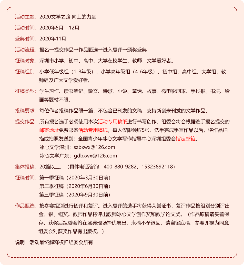 11月21日,由深圳新聞網(wǎng)、全國(guó)青少年冰心文學(xué)盛典中國(guó)·深圳組委會(huì)聯(lián)合主辦,博恩國(guó)際教育集團(tuán)承辦的“第十五屆全國(guó)青少年冰心文學(xué)盛典”在深圳商報(bào)社大廈成功舉行。[詳細(xì)]